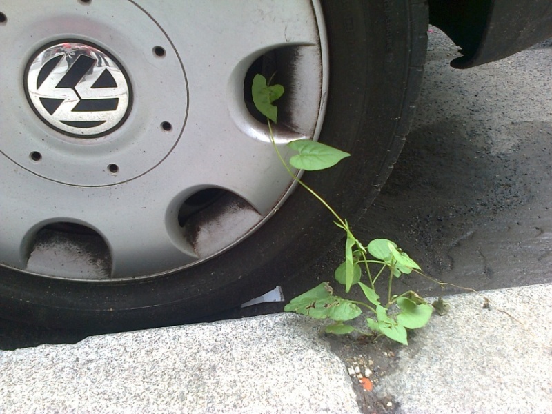 Sorgsamer Umgang mit der Natur macht sich bezahlt: durch längeres Nichtbewegen unseres Büroautos konnten wir einer kleinen Ackerwinde einen würdigen Lebensraum schaffen. Die kleine Pflanze - sie heißt Anna - wird von uns täglich mit frischem Wasser gehegt und gepflegt. Das Auto wurde mit Fahrverbot belegt. Böse Hunde die durch Markierungsarbeiten am Reifen die Anna beschädigen wollen, werden unnachsichtlich beim Umweltbundesamt angezeigt.