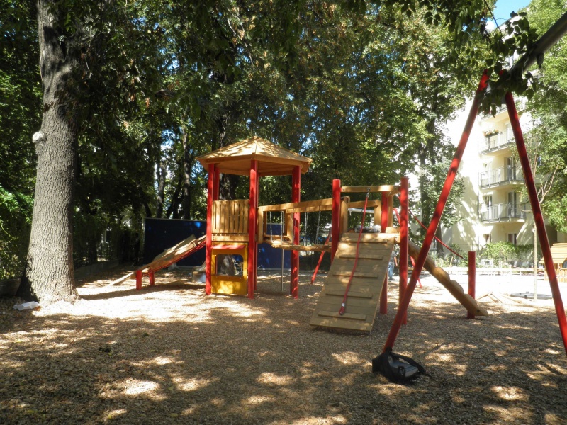 Der Innenhof soll gleichermaßen für Kindergarten- und Hortkinder als Spiel- und Aufenthaltsort dienen. Im Anforderungsprofil seitens des Bauherren wurde der Wunsch geäußert, dass auch Jugendliche aus dem Gymnasium den Hof für Ballspiele nutzen können. So wurde randlich eine multifunktionale Spielfläche mit EPDM-Belag angeordnet. Ein vielseitiges Sandspielareal, ein Bereich mit Kletter- und Schaukelgeräten, Spielhütten, zahlreiche Holzpodeste und ein Geräteschrank zählen nun zur Ausstattung. Ein Asphaltweg schlängelt sich entlang der Funktionsbereiche und gibt Gelegenheit zu Dreirad- und Gokartrunden.