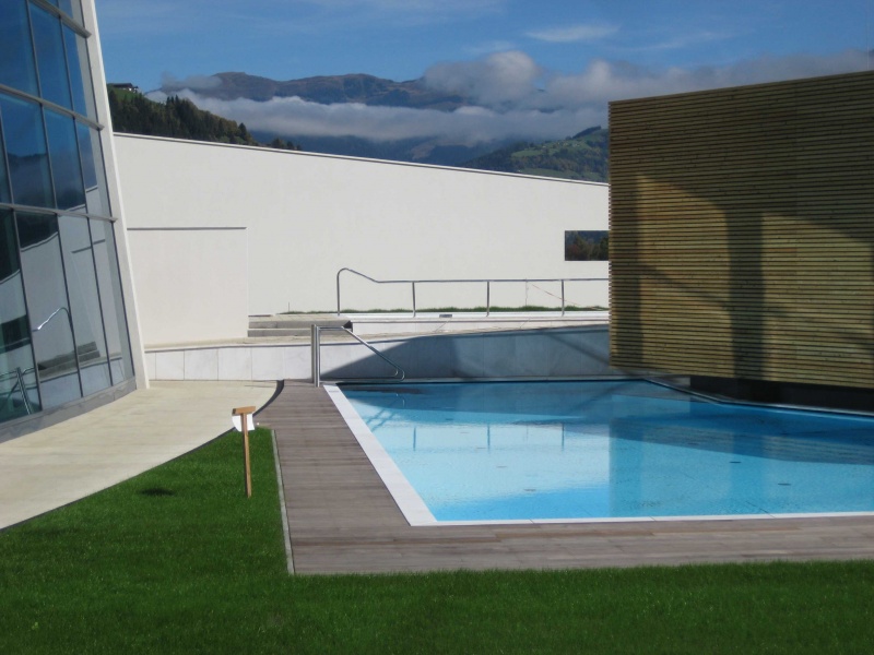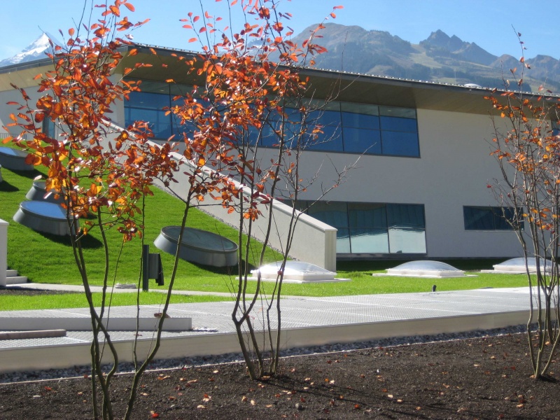 Thermengebäude und Hotel liegen im Talbodenbereich der Salzach. Übergeordnetes Gestaltungsziel der Freiraumplanung ist die landschaftliche Einbindung des Gebäudekomplexes und seiner angelagerten Infrastrukturen wie Parkplatz und Thermenfreibereich in die traditionelle Kulturlandschaft. Die ‚Archetypen’ der umgebenden Landschaft wie traditionelle Wiesentypen, Feldgehölzgruppen und Ufergehölzsäume rahmen nicht nur den Thermenkomplex, sondern ziehen sich als Landschaftskontinuum durch die Anlage. Maximale Transparenz und Öffnung zur weitgehend blickoffenen Landschaftskulisse mit Landmarks wie Kitzsteinhorn gilt es mit den notwendigen, in Hinblick auf Raumbildung und Blickschutz auszubildenden Grenz- und Filterstrukturen (z.B. Saunabereich) zu harmonisieren. Besondere Beachtung waren den vergleichsweise schwierigen örtlichen Bodenverhältnissen (Torfhorizonte, schlechte Sickerfähigkeit, hohes Setzungsrisiko usw.) und der Entwässerungsplanung zu schenken.