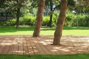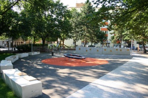 Demgegenüber steht eine zentrale offene Wiesenfläche, die durch eine an eine Rasenwelle angelehnte, ovale Holzplattform unter einer bestehenden Föhrengruppe einen spezifischen Aufenthaltsort bietet. Ein Diagonalweg erschließt den Park und verbindet die unterschiedlichen Funktionsbereiche. Die südliche Wegkreuzung weitet sich zu einer Platzfläche als Treffpunkt für alle und Ort zum ’Abhängen’ für Kinder und Jugendliche.