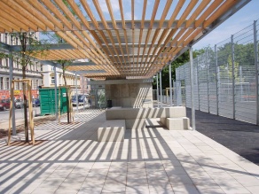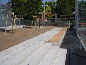 Im Zuge der Errichtung einer Volksgarage wurde in enger Zusammenarbeit mit dem Architekturbüro Weichenberger die Oberfläche des Ludo Hartmannplatzes neu gestaltet. In Hinblick auf die Lage im dicht verbauten, gürtelnahen Stadtgebiet wurde darauf geachtet, einen möglichst großzügigen und vielfältigen Bewegungs- und Aufenthaltsraum zu schaffen. Daher ist der Freiraum überwiegend befestigt, den grünen Raum bilden Baumneupflanzungen. Zwei Ballspielplätze geben mehreren Gruppen Raum sich sportlich und spielerisch zu betätigen. Zahlreiche angrenzende teilweise überdachte Sitzgelegenheiten bieten vielfältige Aufenthaltsqualitäten und werden so zahlreichen Nutzungsansprüchen gerecht. Die verbindenden Wege geben Raum für zahlreiche Bewegungsspiele und –abläufe.