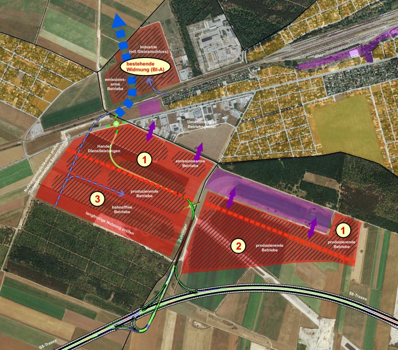 Um eine abgestimmte, geordnete und gemeindegrenzüberschreitende Betriebsflächenpolitik zu erreichen, sollen optimale Standorte für interkommunale Betriebsgebiete gesucht werden. Für den am besten geeigneten Standort an der geplanten S 8-Anschlussstelle Strasshof wurde ein detaillierter Masterplan erstellt.