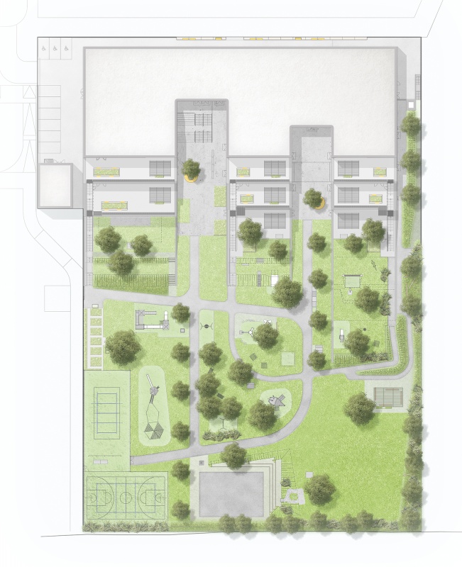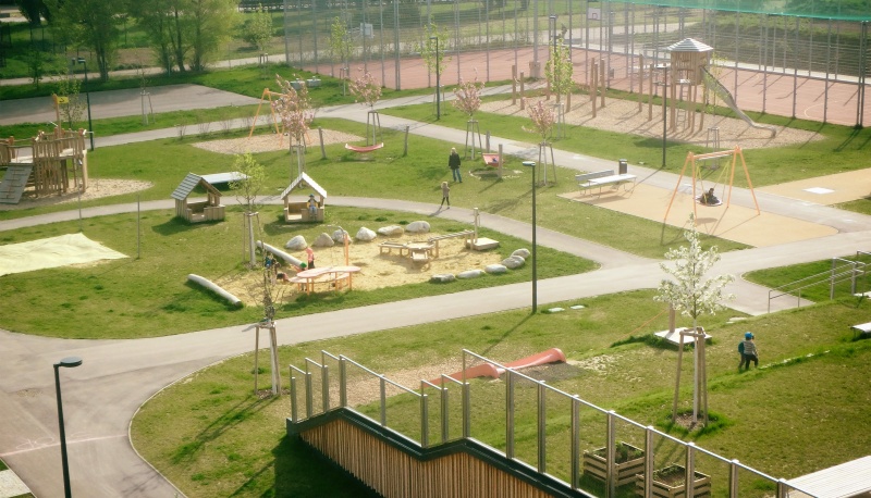 Abgesehen vom eingezäunten Bereich für die Krippenkinder ist die Gartenebene allen Kindern der beiden Schulen als auch des Kindergartens gleichermaßen zugänglich, wobei die Verortung der Ausstattungselemente nach funktionalen Kriterien erfolgte. So sind beispielsweise die Elemente für Kinder mit besonderen motorischen Bedürfnissen - wie eine rollstuhltaugliche Gerätekombination, Tanzglockenspiel, Nestschaukel oder unterfahrbarer Matschtisch - im Nahbereich des Gebäudes angeordnet, die multifunktionalen Sportflächen, die außerhalb der Unterrichtszeiten auch extern genutzt werden, aufgrund der zu erwartenden Lärmentwicklung an der südwestlichen Grundgrenze.
