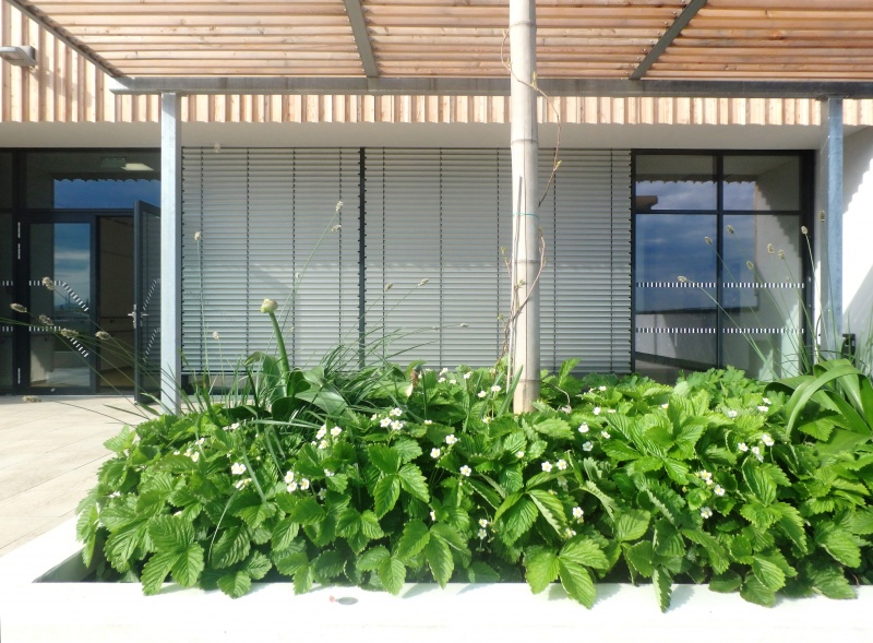 Das Campusgebäude ist an einer künstlichen Geländekante situiert, sodass der Gartenbereich ein Geschoß unter dem Eingangsniveau (EG) zu liegen kommt. Die geschütteten Terrassen der Finger werden zu Spiellandschaften, ausgestattet z.B. mit Boulderwand vor dem Turnsaal, Hangrutsche im Kindergartenbereich und Sandspiel beim flach abfallenden Krippengarten.