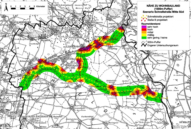 Dabei wurden vom Büro Dr. PAULA - neben der Koordination Raum&Umwelt - folgende Arbeitsschritte für die Fachbereiche Siedlungs- und Wirtschaftsraum, Erholung, Orts- und Landschaftsbild, Sach- und Kulturgüter durchgeführt: Ist-Zustandserhebung, Raumwiderstandsanalyse und Bewertung von netzübergreifenden Planfällen.