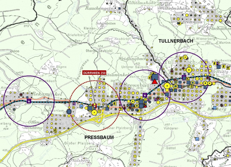 Im Zuge dessen ist nach Inbetriebnahme des Lainzer Tunnels die Verdichtung des Angebots im Personennahverkehr beabsichtigt. Im Zuge der Streckenertüchtigung Wien - Pressbaum - St. Pölten sollen die bestehenden Haltestellen Pressbaum und Dürrwien sowohl aus technischer als auch aus raumordnungsfachlicher Sicht überprüft und optimiert werden. In diesem Zusammenhang wurden vom Büro Dr. PAULA die Einzugsbereiche der Haltestellen sowie die wichtigsten Versorgungseinrichtungen (z.B. Institut Sacré Coeur) erhoben.
