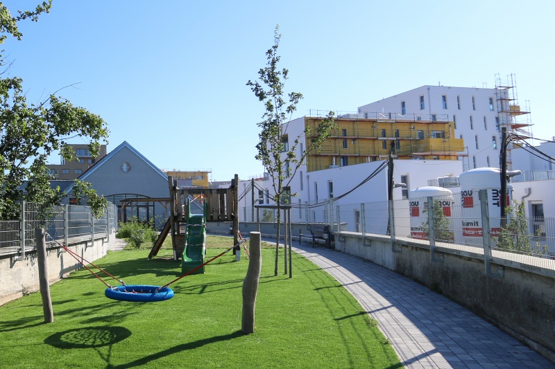 Den Siegern des Europan 10 - Wettbewerbs arenas basabe placios arquitectos war es von Anfang ein wesentliches Anliegen, ein Netz aus Gärten mit einer Vielzahl von Durchwegungen und einer ausgeprägten Nachbarschaft zu etablieren. Insofern stellt der gegenständliche Bauplatz 1 das Herzstück des Wildgartens dar, da er das Nachbarschaftszentrum mit großzügigen Platzflächen und Terrassen, einen Kindergarten und nutzungsoffene Frei- und Wiesenräume für alle BewohnerInnen des Wildgartens bereit hält. Als ökologische Wertstrukturen wurde der Altbaumbestand und dichte Gehölzstrukturen weitgehend erhalten, ein Eidechsenhabitat und bereichsweise Wiesenflächen statt Rasen angelegt.